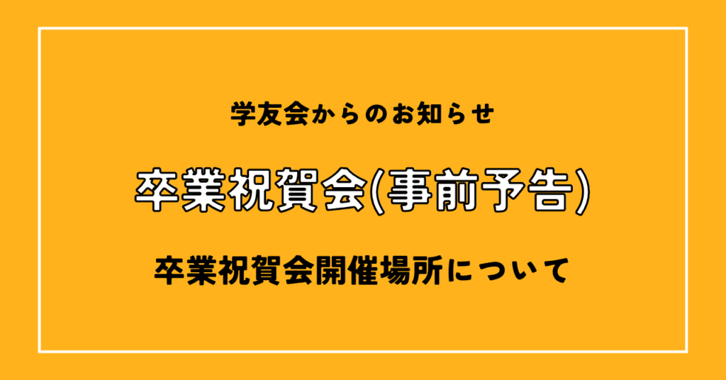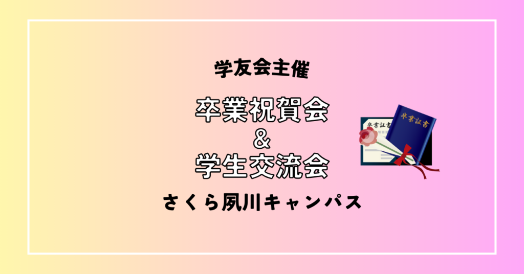 - 学友会主催 卒業祝賀会&学生交流会 開催場所について(事前予告)2025年度卒業証書・学位記授与式後に開催を予定の「学友会主催 卒業祝賀会&学生交流会」は、「さくら夙川キャンパスE棟2階 学生食堂」で開催をいたします。 時間・申し込み方法等の詳細は追って掲載いたします。今年度 […]